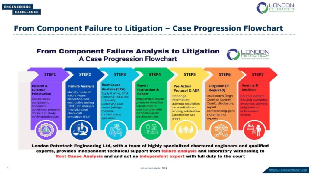 At London Petrotech Engineering Ltd, we provide forensic engineering and expert witness services to help resolve component failures that often escalate into legal disputes. Our approach ensures technical accuracy and compliance with legal standards from start to finish.